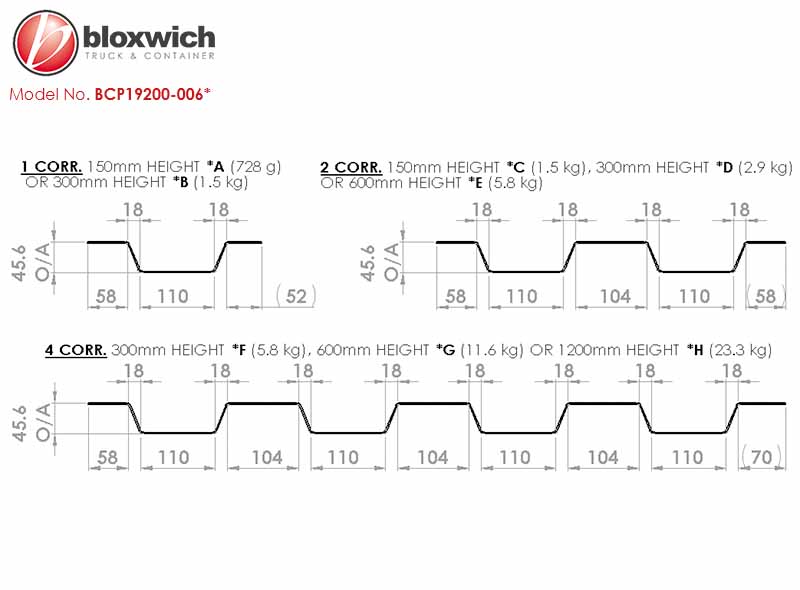 Use: Standard ISO container front end panel patches in widths of 1, 2 or 4 corrugations and with several height options. Typically welded to the outside of shipping container front ends to repair damage, corrosion or vandalism.